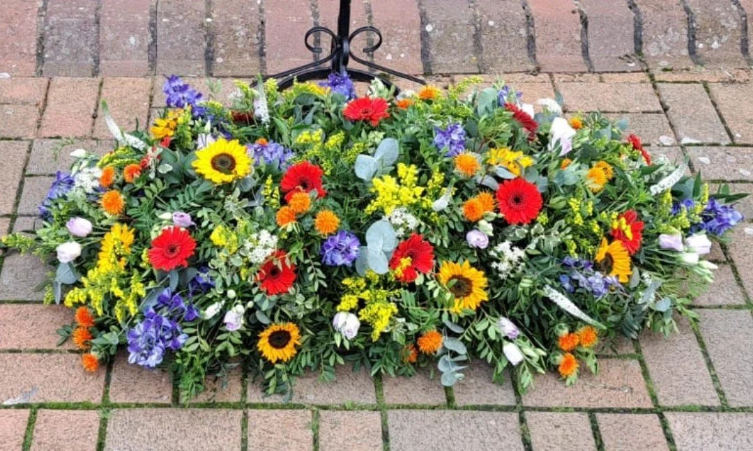 A simple but beautiful floral tribute. Much like a hand tied bouquet, created with layers of flowers and foliage, which lays flat and is tied with a hessian ribbon or raffia bow. Can be ordered by any mourner, and lay next to the casket or grave. Can be made so that it is suitable for eco friendly burials.